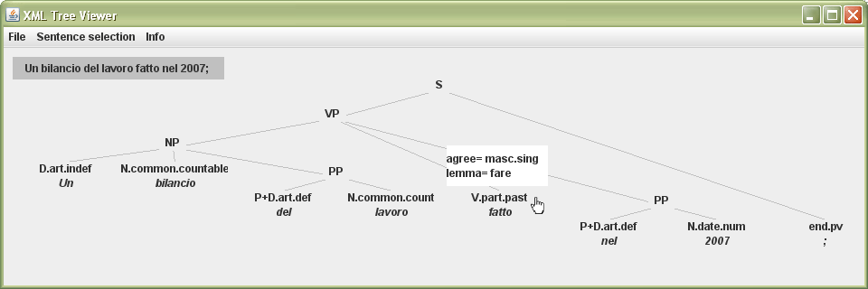 A very simple utility that displays an annotated / tagged (set of) sentence(s) as syntactic tree(s). This tool allows you to: (semiautomatically) tag (SUT tagset V1.0) a text file (encoding iso-8859-1, one sentence per line). Open, display, edit and save well-tagged XML files, drag the tree structure on the window frame, export tree structures as gif images. (it requires Java JRE6)